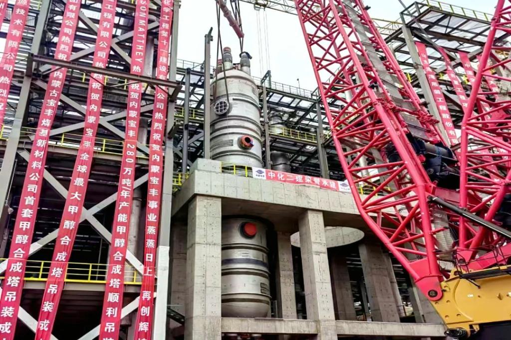 该甲醇合成塔单台重达631吨,长度超过28米,是目前世界单套煤制甲醇产量最大的甲醇合成塔,也是该年产280万吨甲醇项目的关键设备。