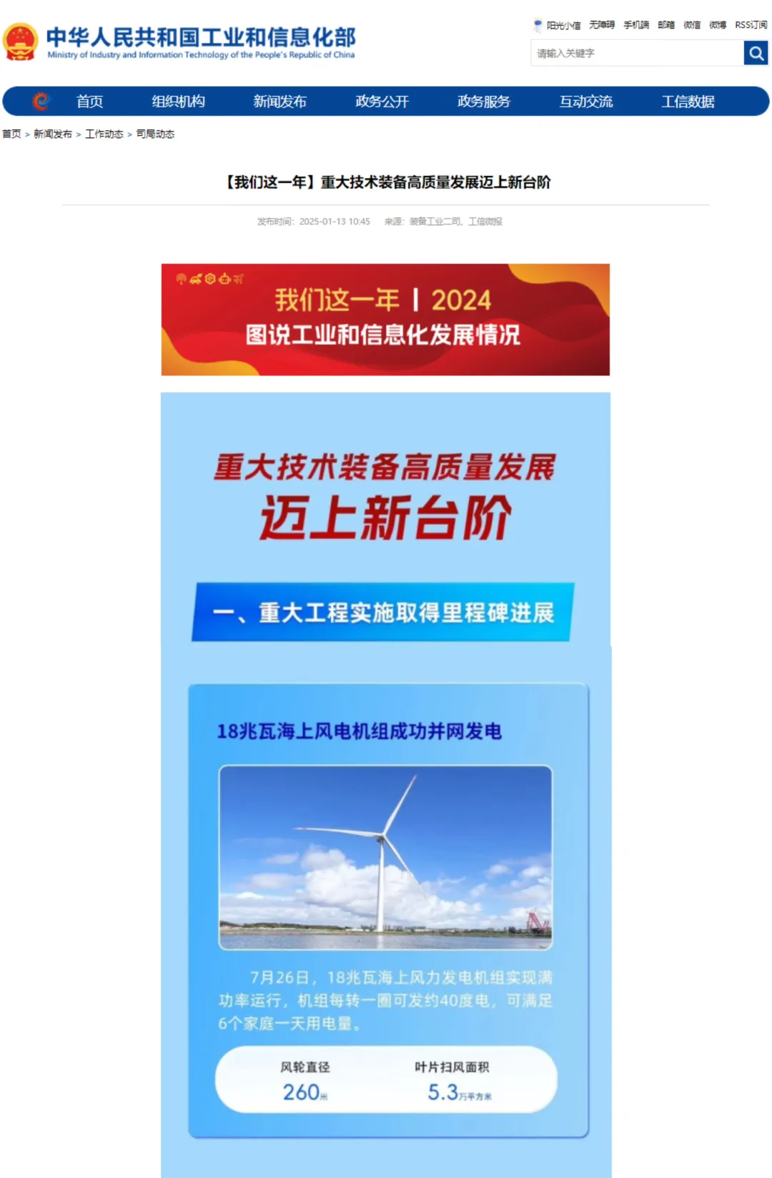近日,工信部发布“【我们这一年】重大技术装备高质量发展迈上新台阶”列举了2024年重大技术装备取得的突出成就人生就是搏“18兆瓦海上风电机组成功并网发电”入选“重大工程实施取得里程碑进展”